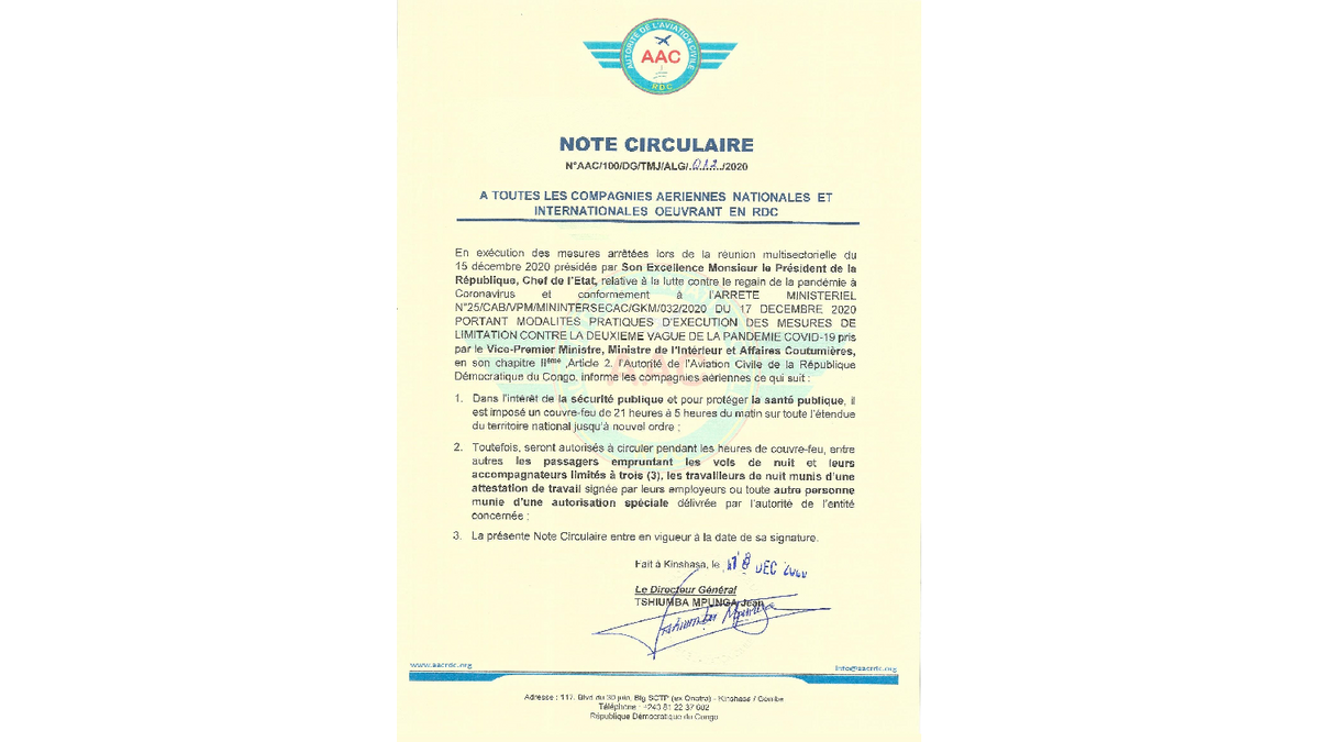 Précisions de l'Autorité de l'Aviation Civile - 18-12-20, concernant les mesures spécifiques liées au couvre-feu