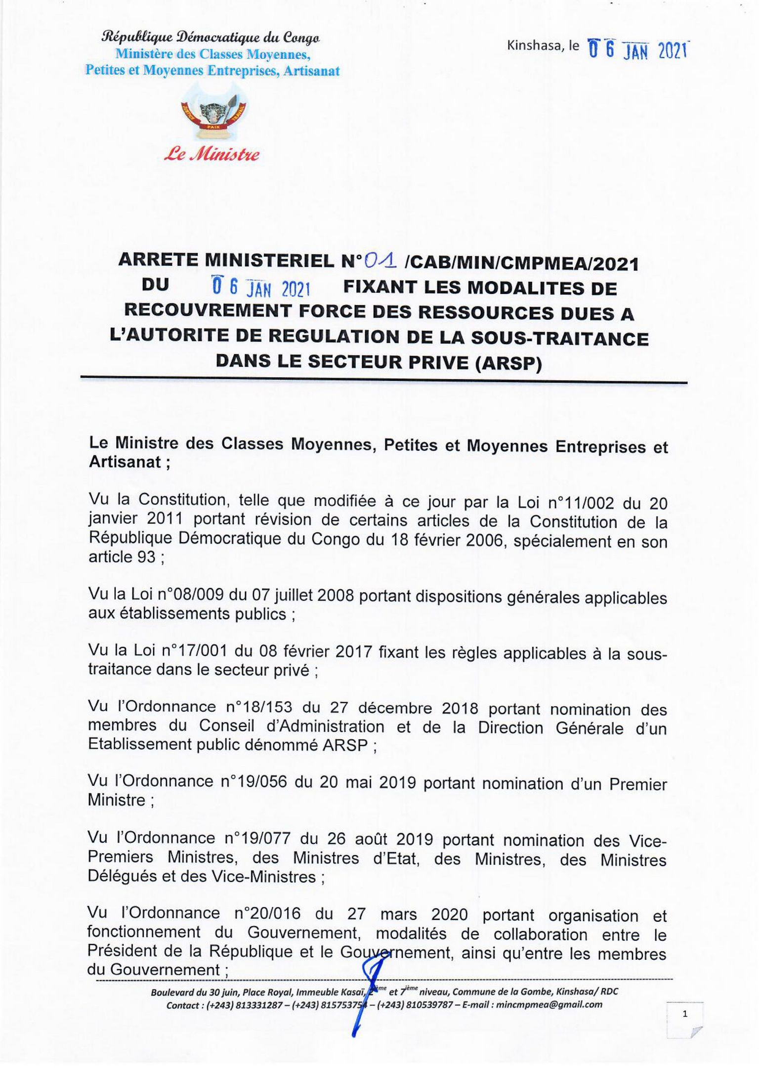 Arrêté Ministériel N°01 du 6 jan 21 fixant les modalités de recouvrement forcé des ressources dues à l'ARSP