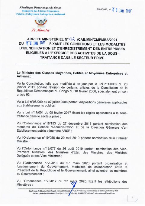 Arrêté Ministériel N°02 du 6 jan 21 fixant les conditions et modalités d'identification et d'enregistrement des entreprises éligibles à la sous-traitance