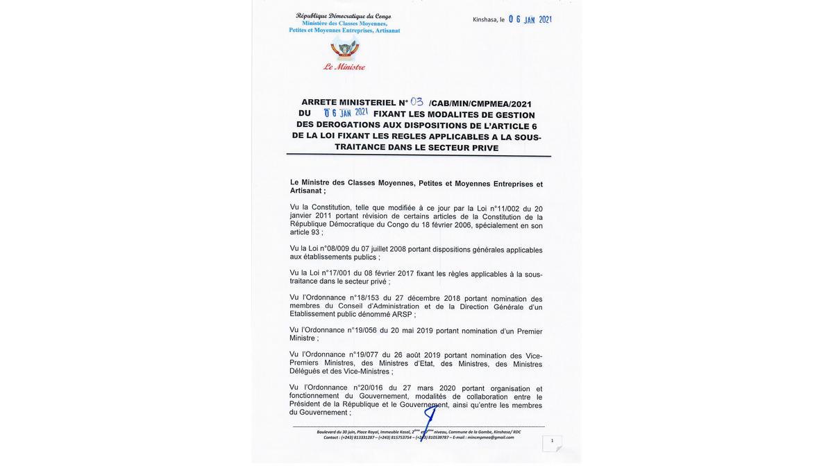 Arrêté Ministériel N°03 du 6 jan 21 fixant les modalités de gestion des dérogations aux dispositions de l'article 6 de la loi sur la sous-traitance