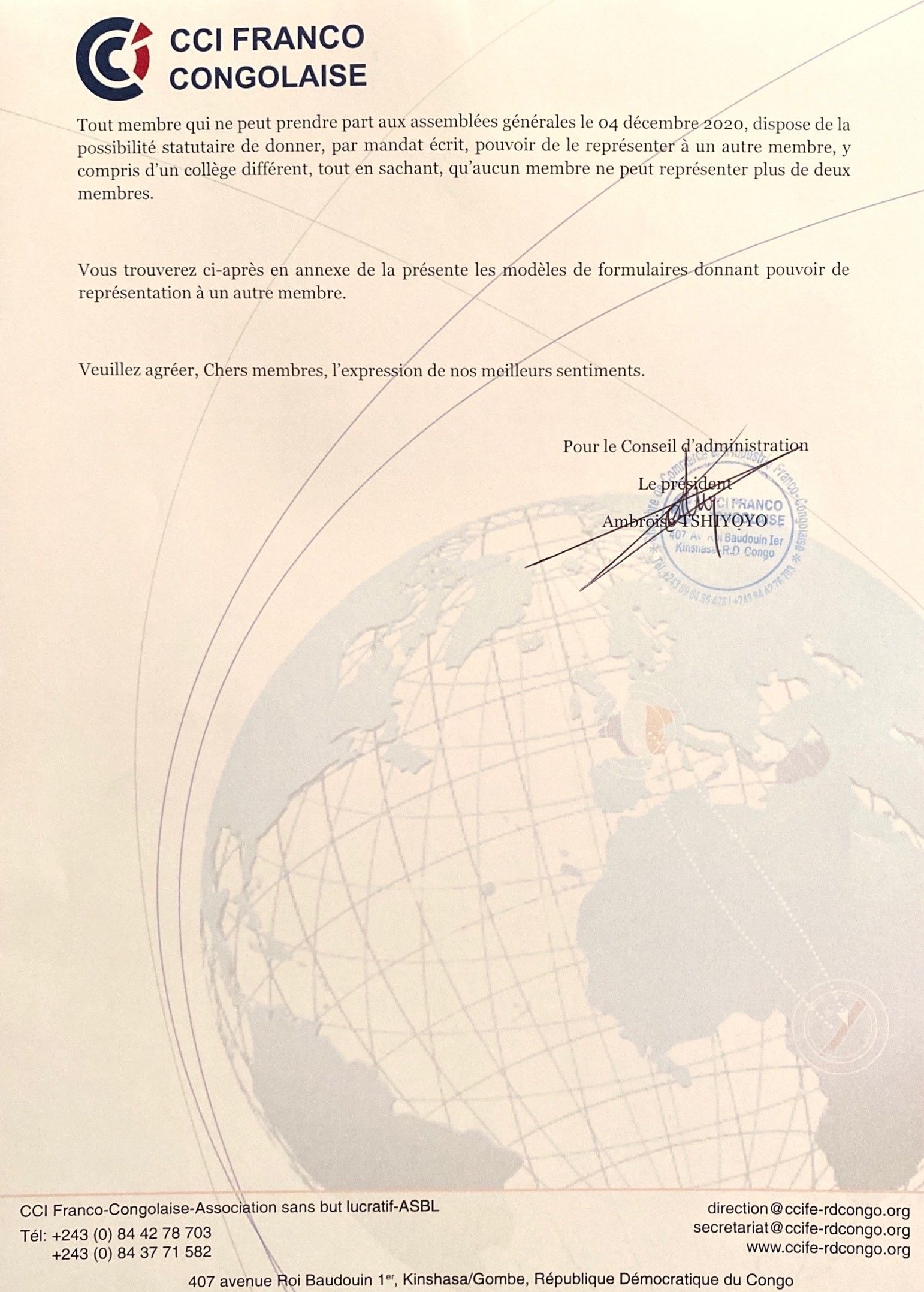 Les assemblées générales extraordinaire et ordinaire élective de l'année 2020 se tiendront le vendredi 4 décembre 2020 à 16 heures au PULLMAN - salon Kasai.