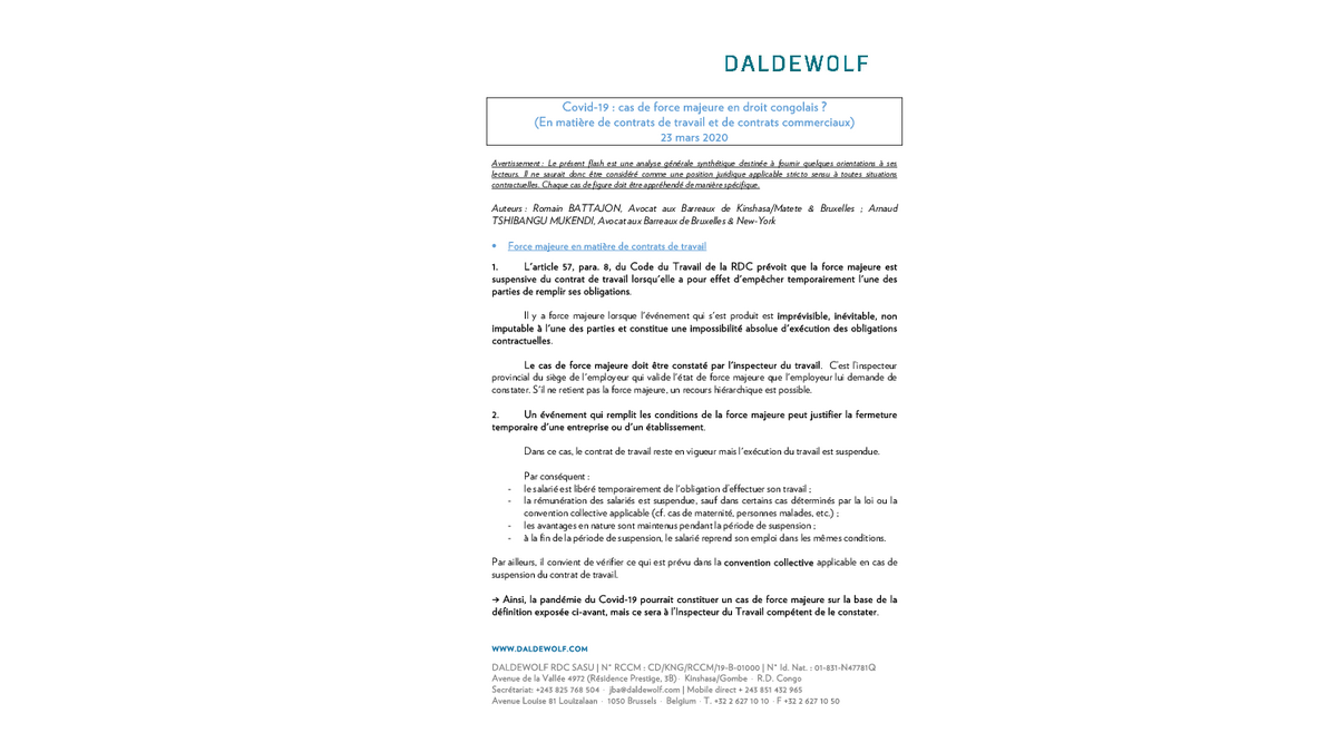 Cas de force majeure, dans le droit congolais - par le Cabinet DALDEWOLF - 26 Mars 2020