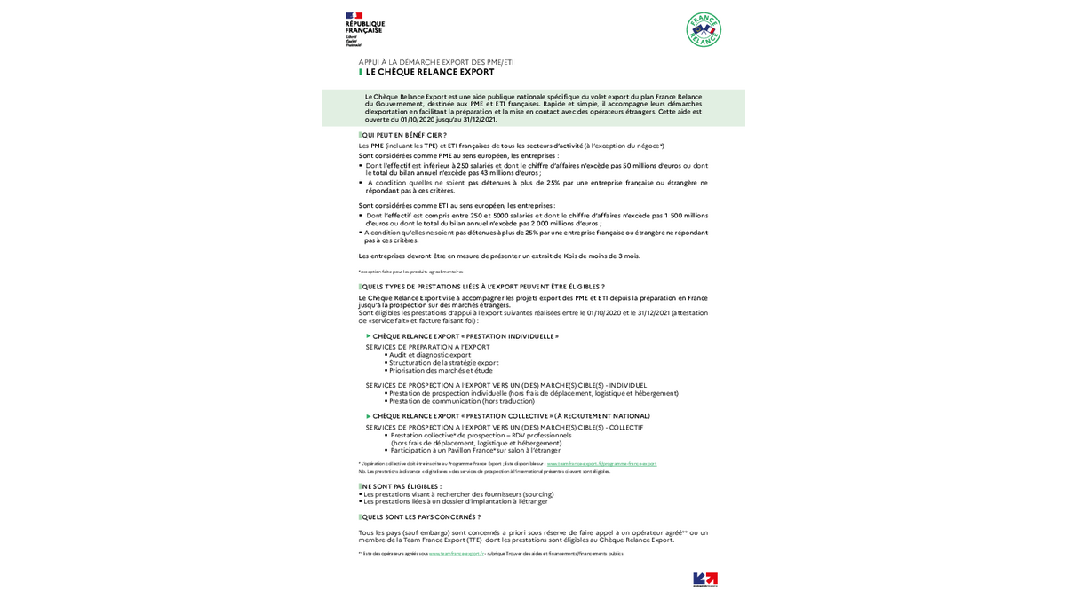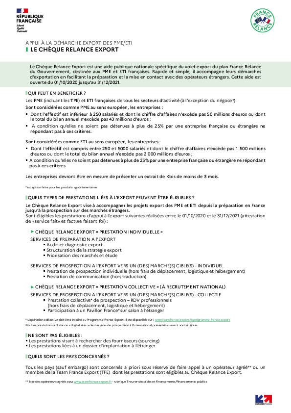 Le Chèque Relance Export est une aide publique nationale spécifique du volet export du plan France Relance du Gouvernement, destinée aux PME et ETI françaises. Rapide et simple, il accompagne leurs démarches d’exportation en facilitant la préparation et la mise en contact avec des opérateurs étrangers. Cette aide est ouverte du 01/10/2020 jusqu’au 31/12/2021.
