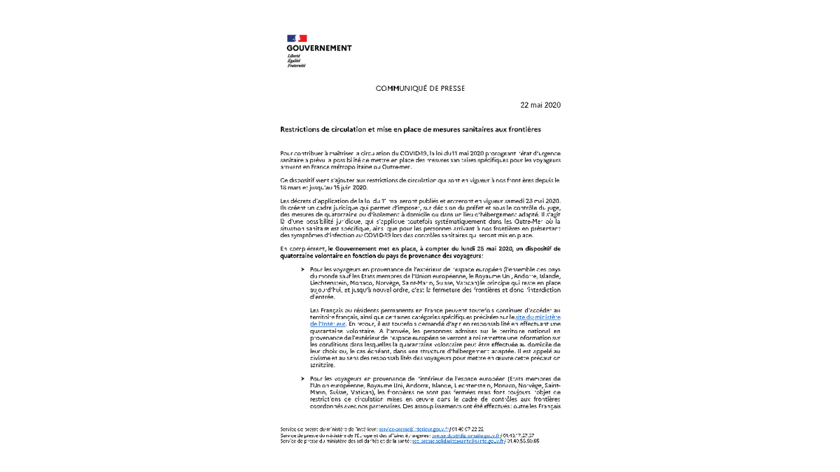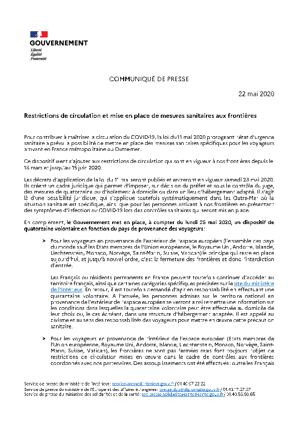Communiqué du Ministère Intérieur Français - Quatorzaine volontaire à l'arrivée des voyageurs en provenance de l'étranger 22-05-20