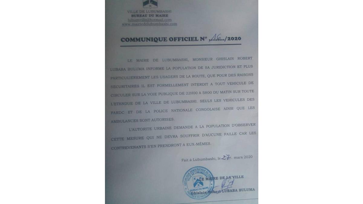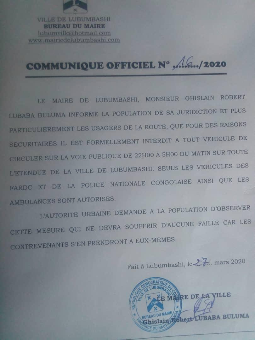 Communiqué Officiel Mairie de Lubumbashi - 27 Mars 2020