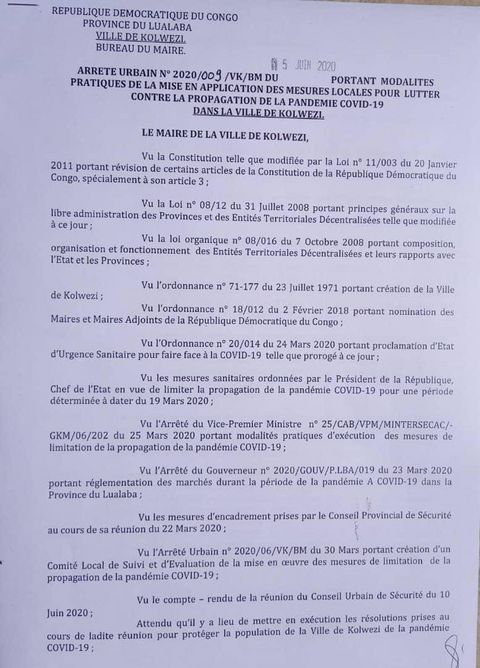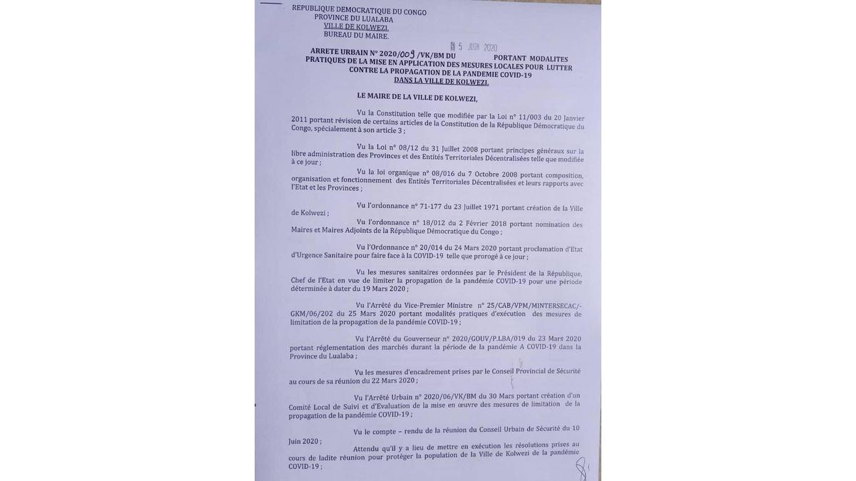 MAIRIE DE KOLWEZI - Arrêté Urbain - Modalités Pratique des Mesures de Lutte contre le Covid 19
