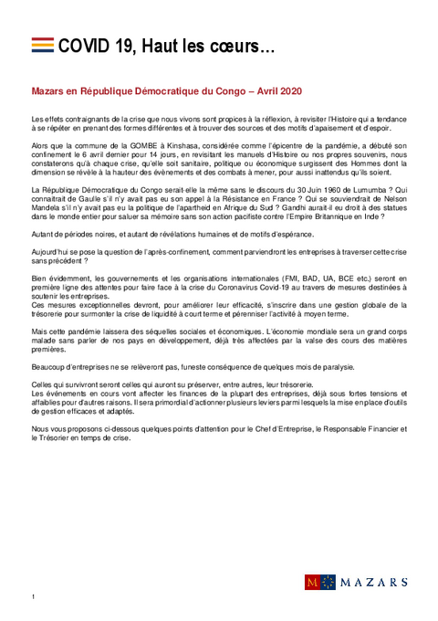 MAZARS - COVID 19 - Réflexions sur la gestion de trésorerie en temps de crise