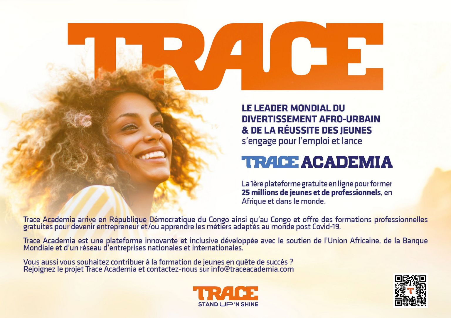 Actuellement, TRACE lance en France et sur le continent Africain, Trace Academia, une plateforme en ligne dédiée à la formation et à l'employabilité des jeunes exclus du marché de l'emploi. Gratuite et accessible à tous, Trace Academia offre une méthode d'apprentissage "d'etutainment" qui mêlent le meilleur des neurosciences et du divertissement. Ce projet est porté par Trace Global dotée d'une expertise unique auprès des jeunes urbains de 15-34 ans autant sur le continent africain (anglophone et francophone) qu'en France.