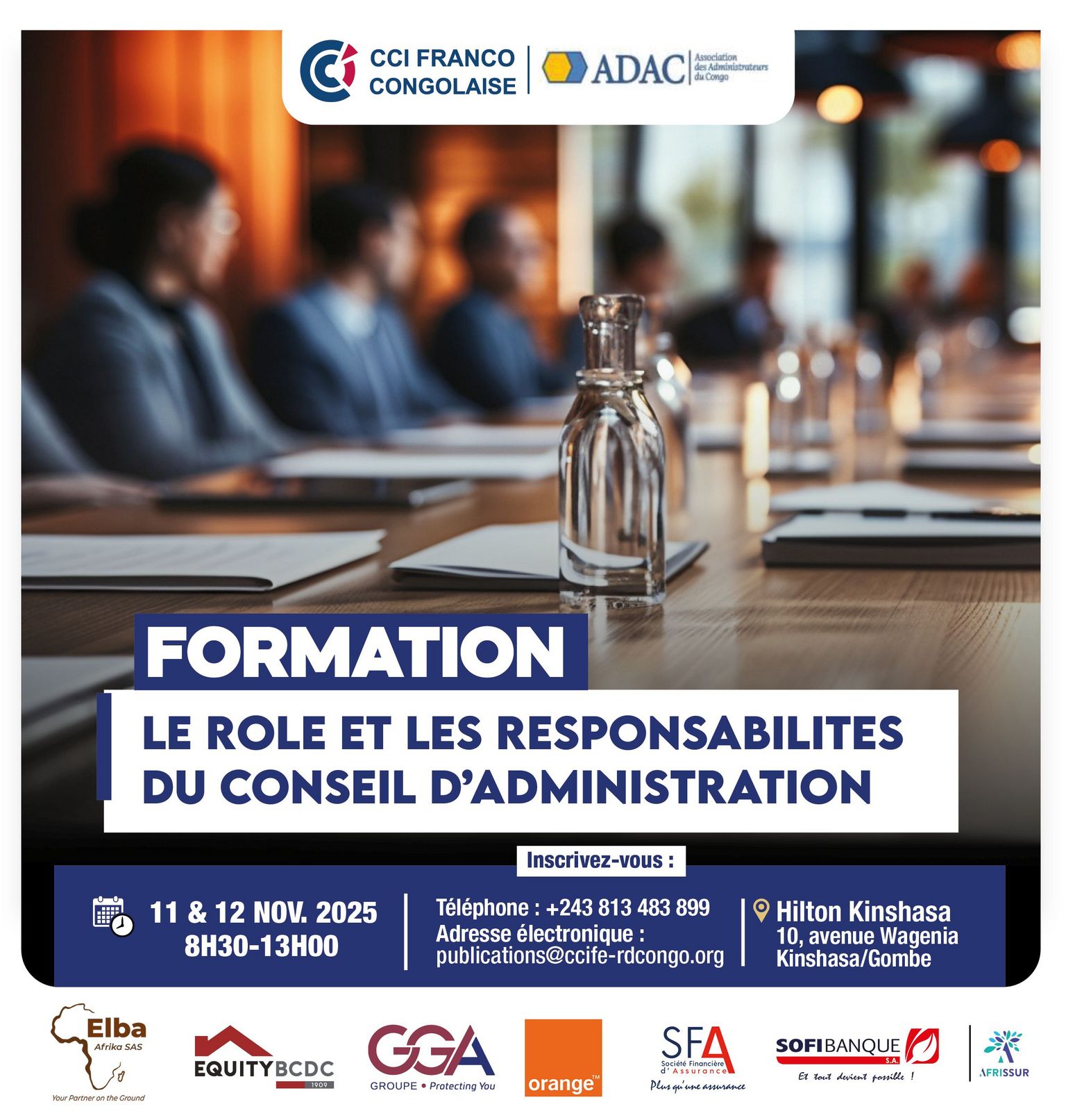 La Chambre de Commerce et d'Industrie Franco-Congolaise en partenariat avec ADAC (Association des Administrateurs du Congo) organise une formation portant sur le thème : Le rôle et les responsabilités du Conseil d’administration