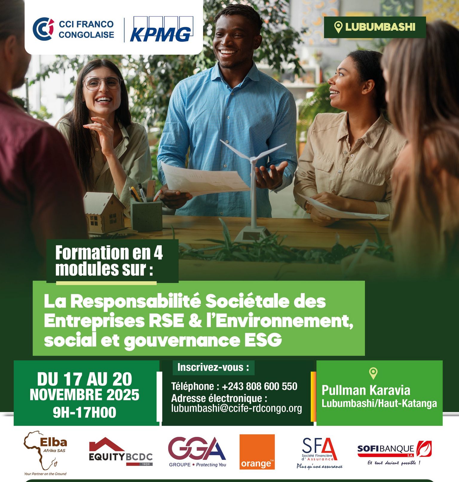 La Chambre de Commerce et d’Industrie Franco-Congolaise organise une formation en partenariat avec KPMG du lundi 17 au jeudi 20 novembre au Pullman Karavia sur : la Responsabilité Sociale des Entreprises (RSE) et l’Environnement, social et Gouvernance (ESG).