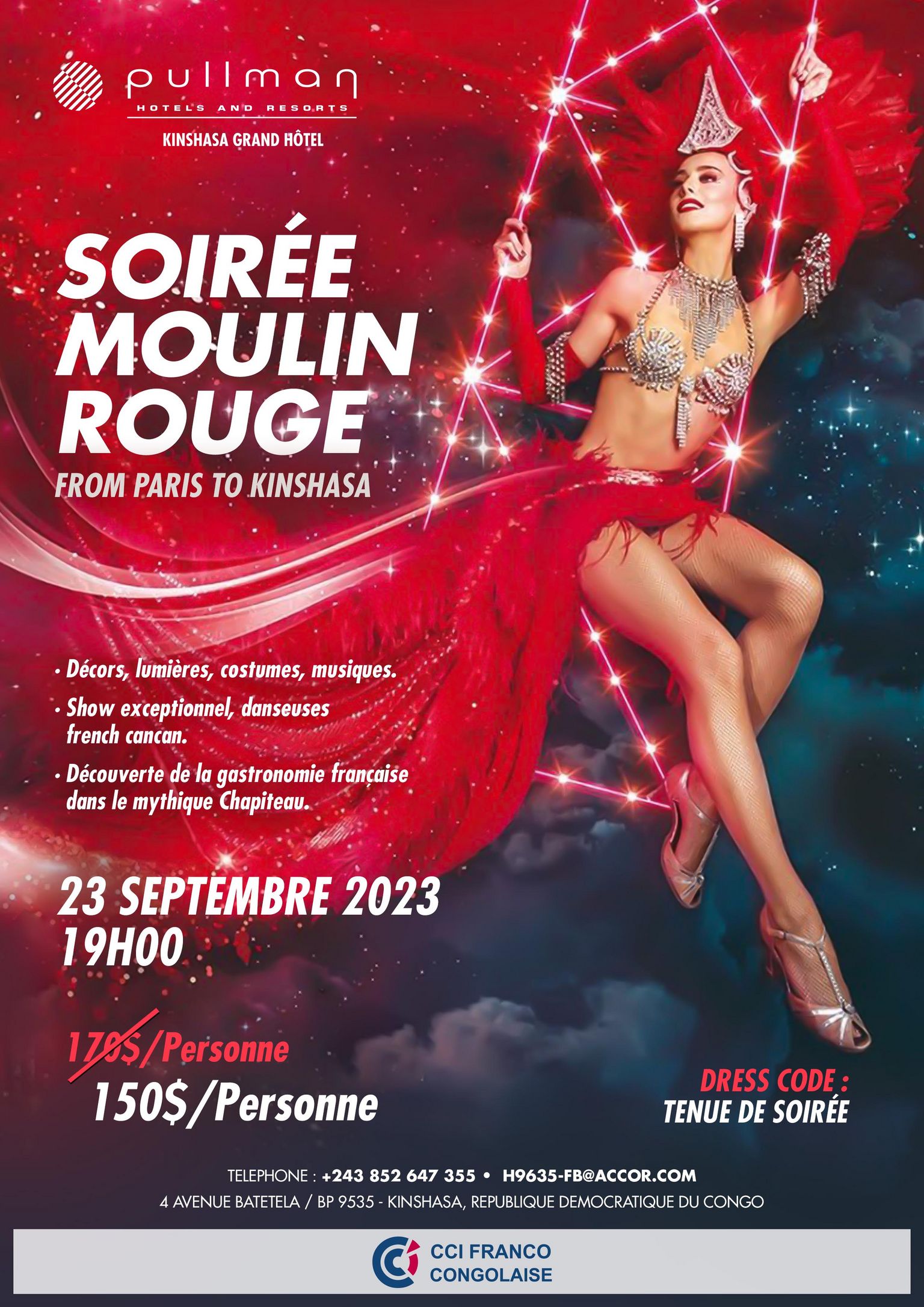 Soirée Moulin rouge Décors, lumières, costumes, musiques Show exceptionnel, danseuses french cancan.