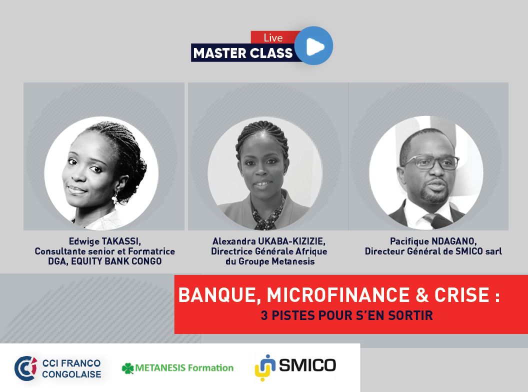 Nous vous invitons à prendre part à la deuxième session de master class de ce Samedi 20 juin 2020, de 10h00 à 11h00 (heure de Kinshasa), sur le thème : « BANQUE, MICROFINANCE & CRISE : 3 pistes pour s'en sortir ? »