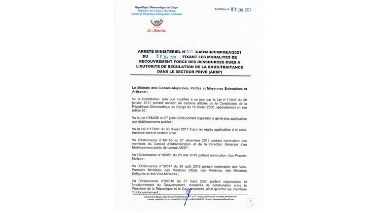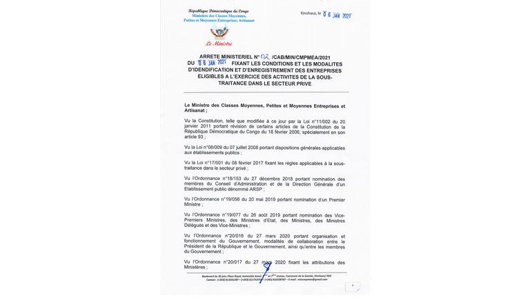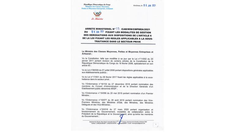 JORDC promulgant les 3 arrêtés ministériels du 06 janvier 2021, concernant la loi sur la sous-traitance