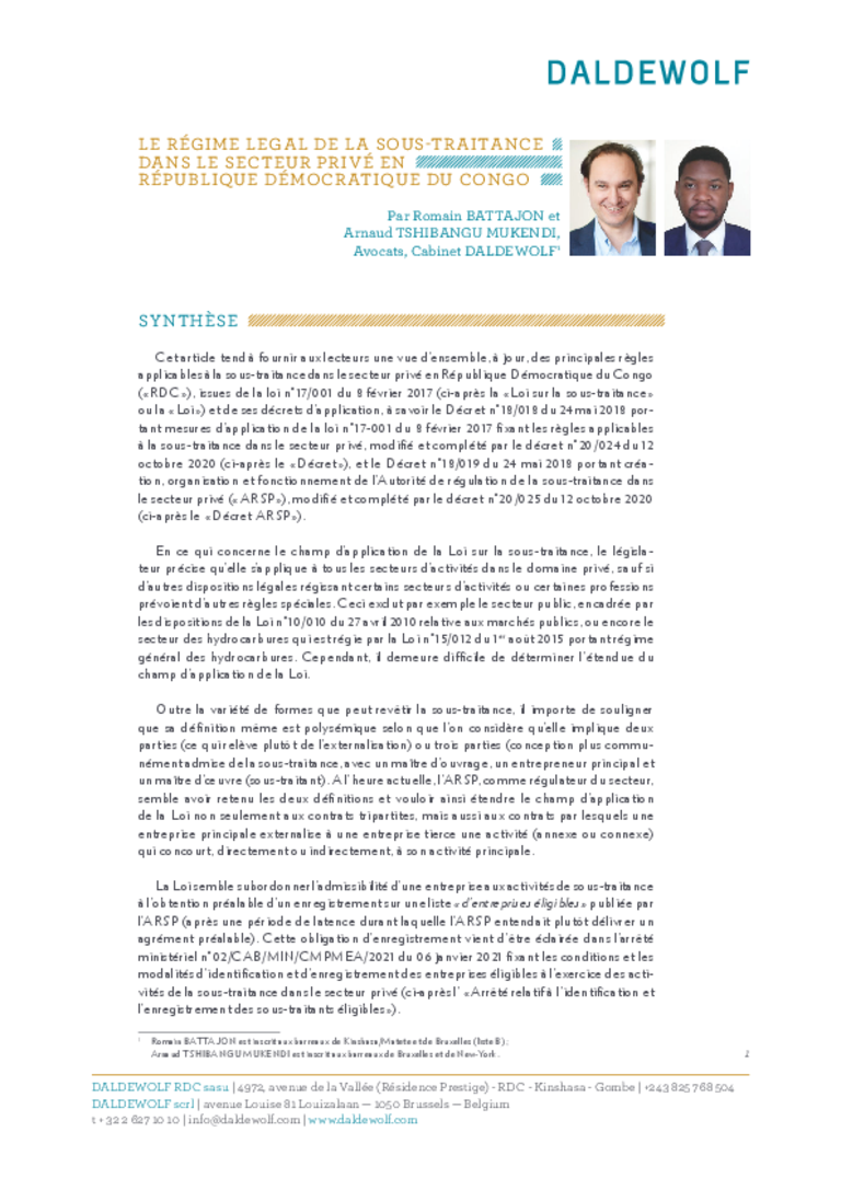 Régime légal de la sous-traitance dans le secteur privé, par le Cabinet DALDEWOLF